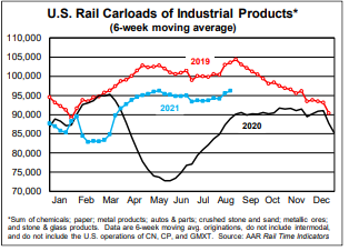 In August 2021, of the 20 freight categories the American Association of Railroads tracks, 14 of those categories were higher than August 2020. Only six categories topped their August 2019 mark.