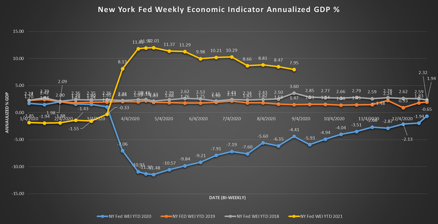 We always close with the Fed economic index. Through the summer WEI readings have continued at a strong pace. Remember, GDP is calculated as a percentage gain over the previous year’s rate. Accordingly, we expect to see this number continuing to trend toward the mean. The question is: How quickly does it drop?