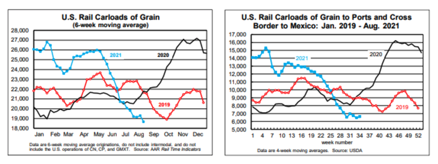 Muddling along, that is the feel of this economy and the rail industry. It may feel like a blur but we are now almost 18 months since the original Covid lockdowns that began in March 2020. For all of that time, we have had months where the economy felt like it was about to take off like a rocket ship, followed by months stuck on the launch pad. In August, the total weekly average railcar loadings were 233,691. Excluding coal, weekly railcar loadings were 167,140 or just 2.5% over August 2020 and -7.7% lower than August 2019.
