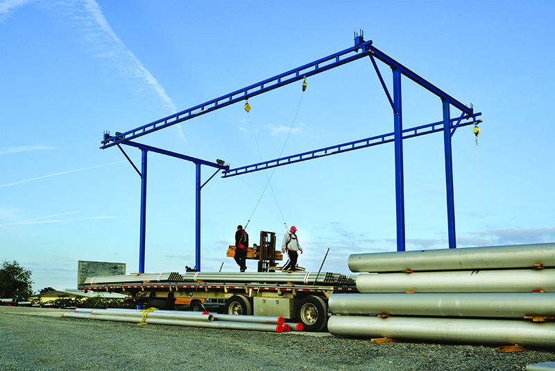 Loading Flatbed Truck With Pipe: The monorail shown uses dual track, allowing two workers to pass one another without disconnecting the lanyard from their harness.