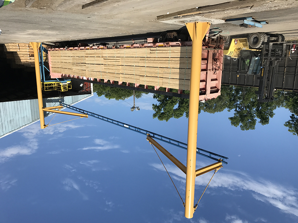 They found a solution, with a lower cost than a new building that allowed the workers to remain on the truck, in the form of two free standing Tether Track fall protection systems by Gorbel®. The primary system features two cantilevered monorails, enabling two flatbeds to be loaded in the same area simultaneously. Each monorail uses Gorbel’s dual track, allowing two workers to pass one another safely without disconnecting the lanyard from their harness.