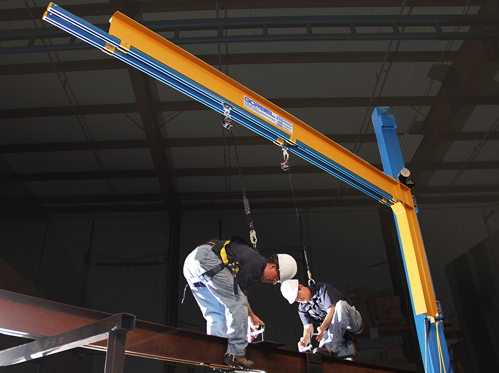 Working Together: When a job requires two people working together, the dual Gorbel Tether Track system allows two workers to pass each other while they are both supported by the same overhead track system. The dual Gorbel Tether Track System can be mounted from overhead beams, jib cranes, or free standing gantry cranes.