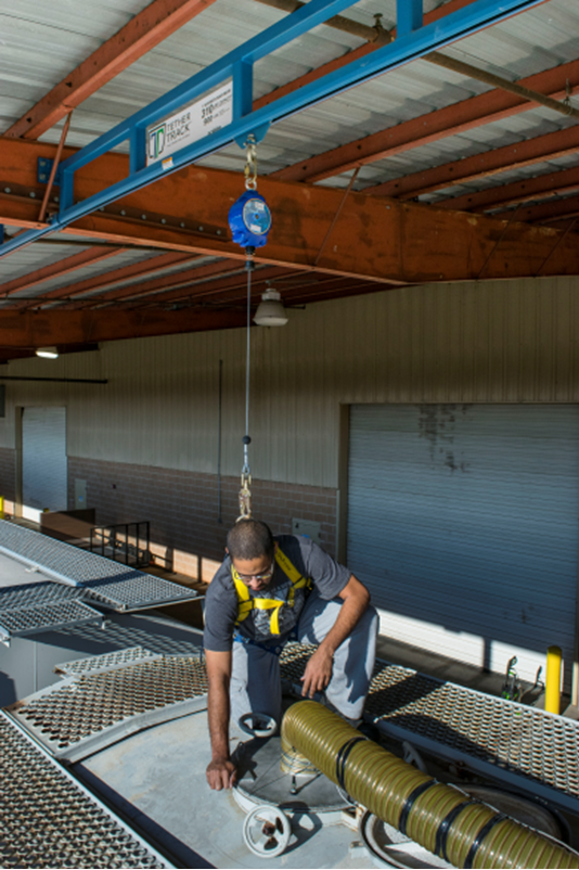 A Gorbel Tether Track™ monorail system was chosen as the best option, and by notching the canopy beams, the track was able to be raised up into the girder underneath. The notched areas were then reinforced with angle iron that was bolted into place. This allowed for the proper height requirements to be met. The Tether Track Fall Protection System gave the on-site safety manager reassurance that the employees were kept safe when on top of the rail cars.