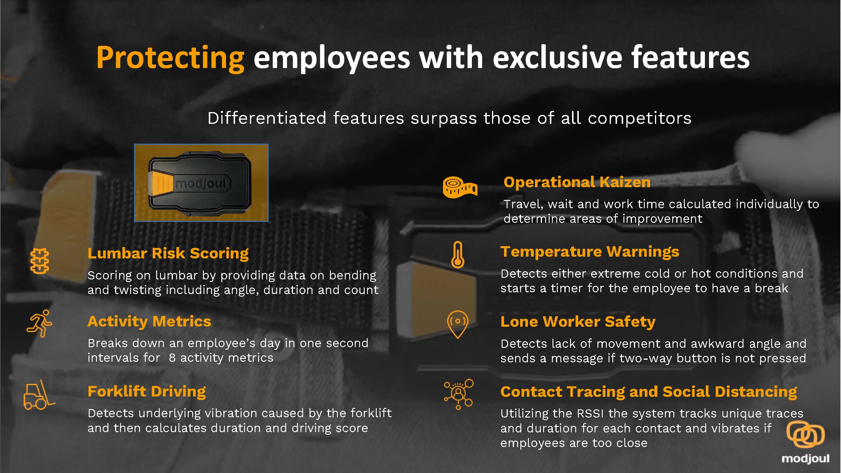 The Modjoul platform works by measuring and recording an average of over 27,000 data points over an 8 hour shift. The device helps eliminate injuries in two ways.