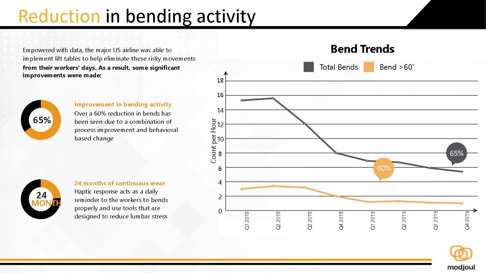 With your Modjoul package you are not just getting the device and account access. As part of a campaign we will conduct regular data reviews with you throughout the life of the equipment*. We will help compile and present the data so you can see progress in reducing risky bends and movements. We will help conduct campaigns with your team members to build buy in from personnel participating in the project.